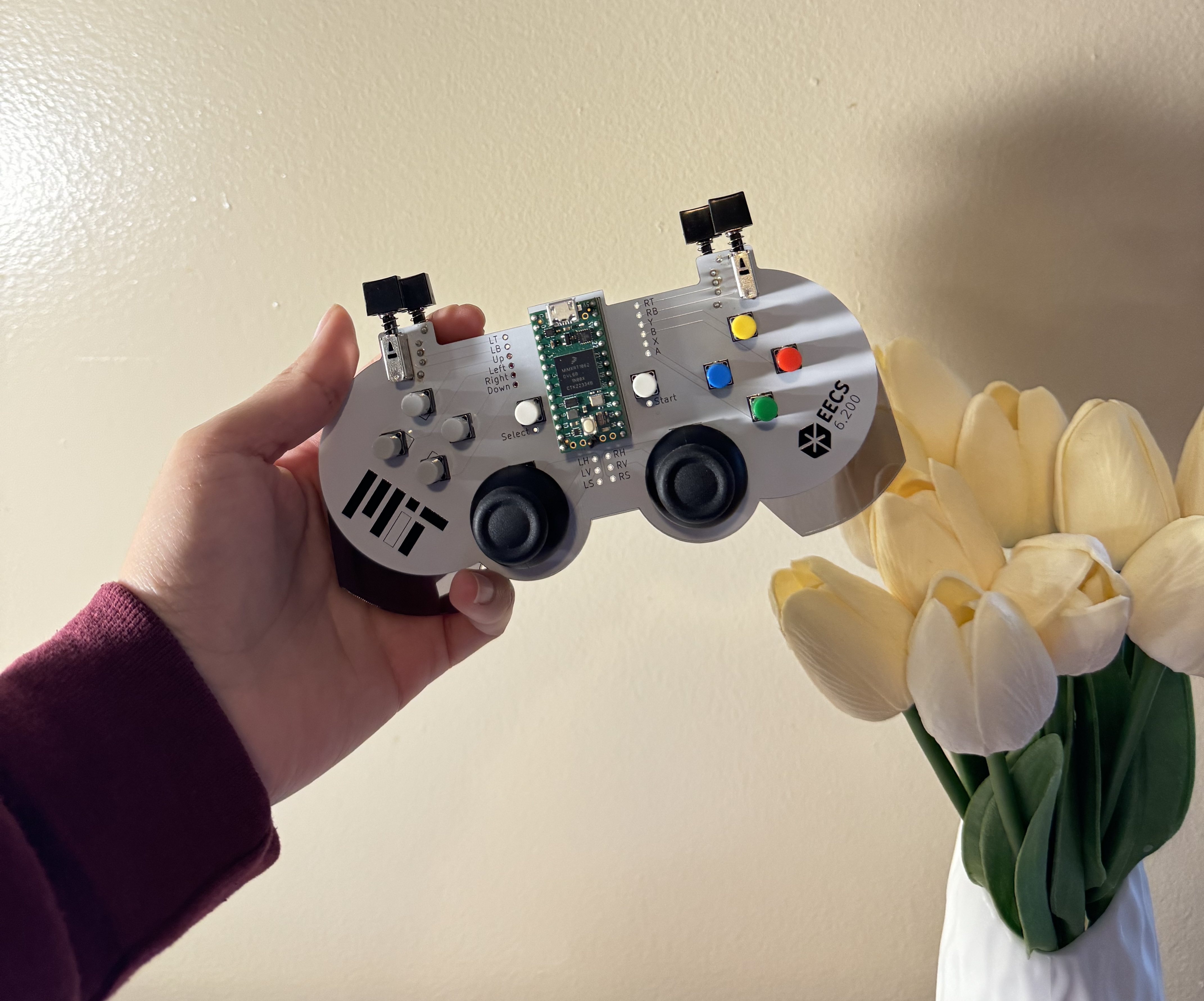 Hand-assembled USB game controller with analog joystick and digital buttons.